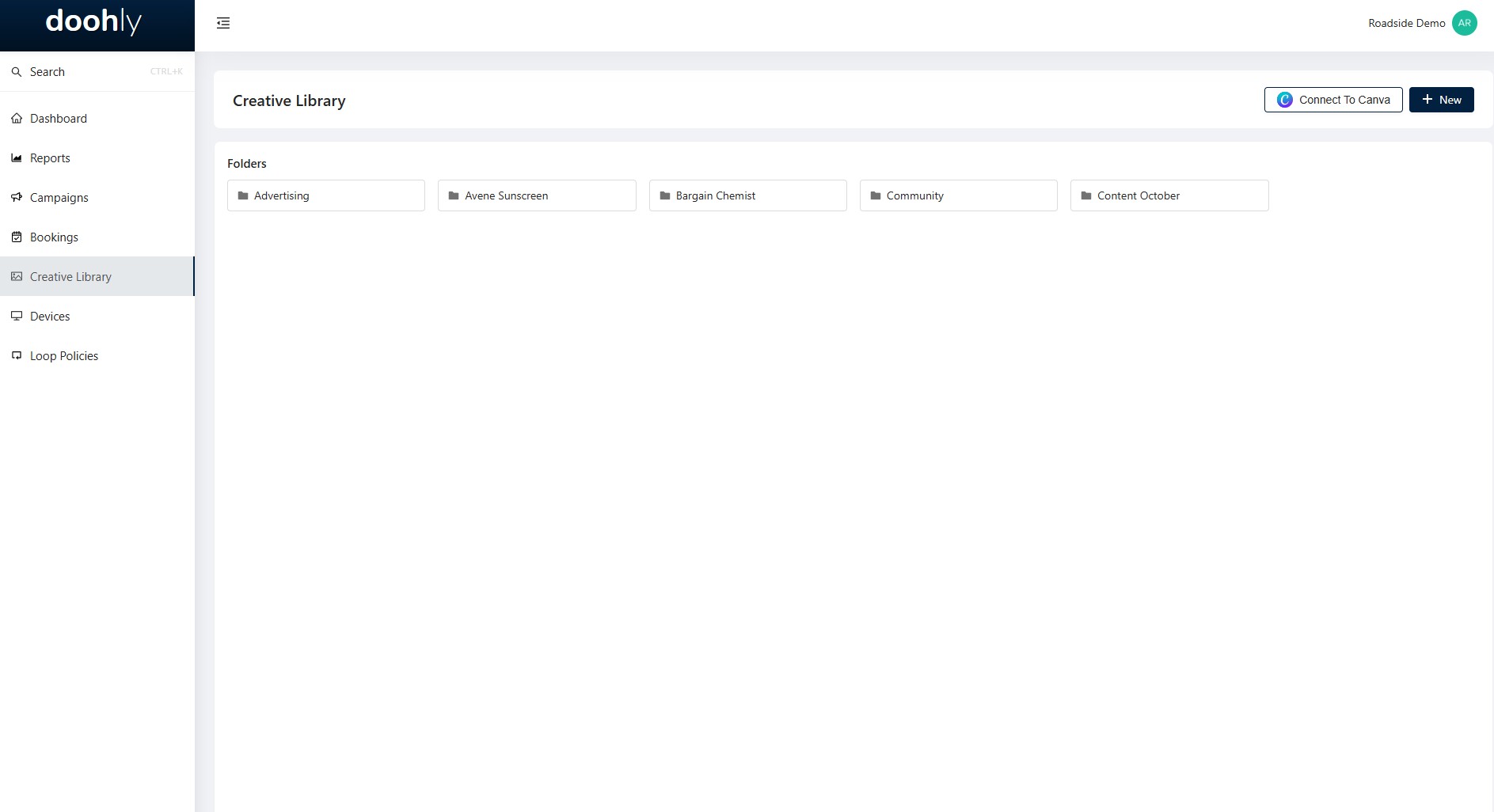 To access the integration, simply access your “Creative Library” and look for the “Connect with Canva” button on the top right of your screen. You will need to log into your Canva account to access features directly from Doohly.
